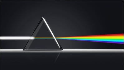 When white light enters a prism of glass (a raindrop has a similar effect), the light slows down and bends, but each wavelength within it bends by a slightly different amount. This causes the colors that were traveling together to spread apart, and it reveals this spectrum we call a rainbow. The prism or raindrop doesn’t create the colors, it just gives space for what was unified to now become visible.