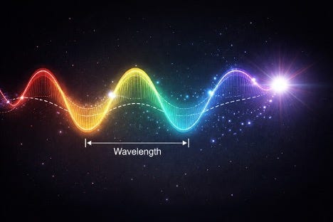 Light travels as waves of energy. It’s called a wavelength. A wavelength is simply the distance between one wave crest and the next. Longer wavelengths carry less energy and they appear to us as reds. Shorter wavelengths carry more energy and appear as blue or purple. So different colors are the same light, but they are spaced differently.